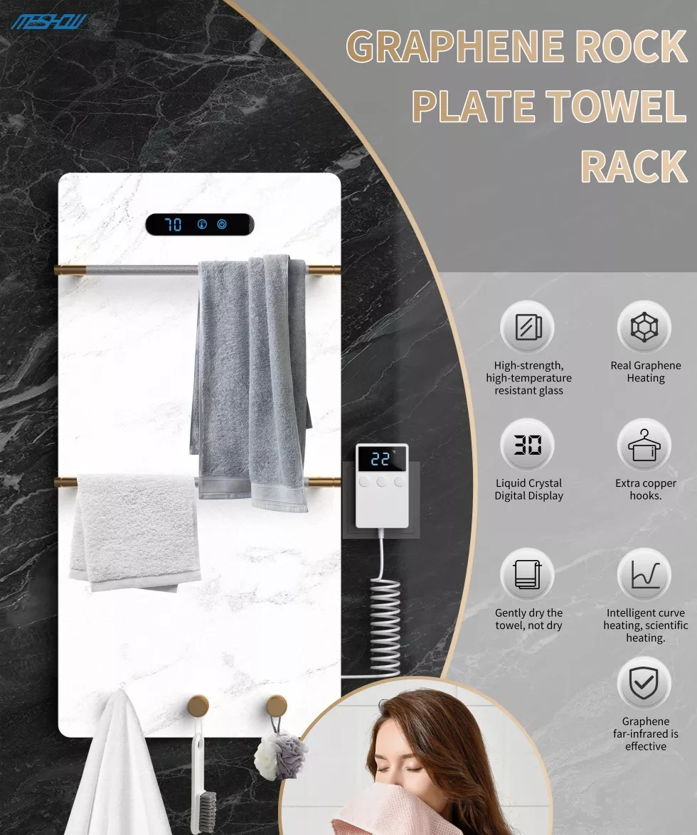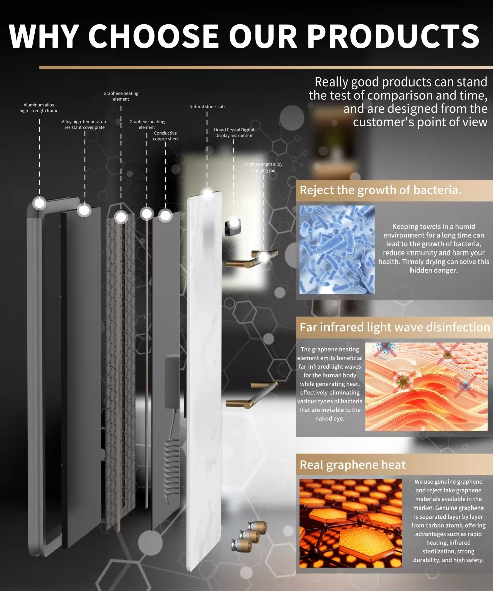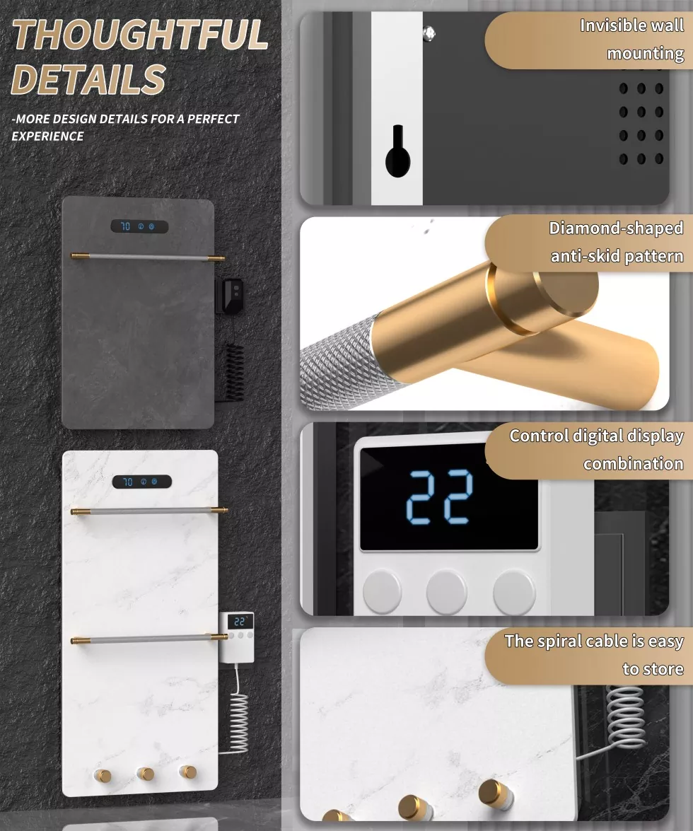 Ang kumbinasyon ng mga puting rock panel at matte metal na nakabitin na mga pole ay simple ngunit naka -istilong, angkop para sa iba't ibang mga dekorasyon sa bahay. Ang natural na texture at pangkalahatang texture ng rock slab ay nagpapaganda ng antas ng banyo; IPX4 hindi tinatagusan ng tubig, walang takot sa mga patak ng tubig, na angkop para sa mamasa -masa na mga puwang sa banyo. Ang graphene rock towel rack ay mabilis na pagpapatayo at mahusay, na may malayong infrared isterilisasyon at epektibong pag-iwas sa bakterya at mites, pinapanatili ang malinis na mga tuwalya. Pambansang pamantayang puting graphene rock frame, 3-taong warranty, maligayang pagdating upang makipag-ayos!
